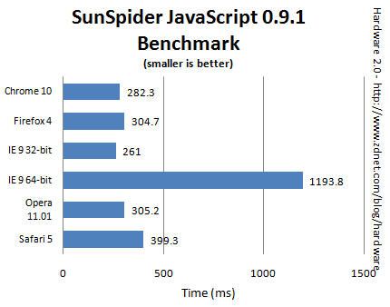 – El rendimiento de Internet Explorer 9 de 64 bits es lamentable frente al resto, por lo que incluso aunque utilices sistema operativo Windows de 64 bits pasa de él totalmente y utiliza la versión de 32 bits. Conviene puntualizar que esta versión no utiliza el motor Chakra JIT de la versión de 32 bits.