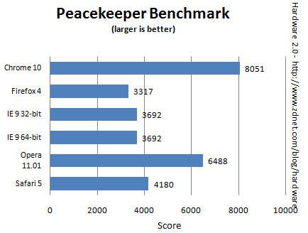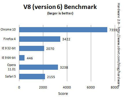 Tras el lanzamiento de Firefox 4 se completa el círculo con la última generación de navegadores web. Enfrentadas las últimas versiones de los más populares en pruebas de rendimiento Javascript, Chrome sigue en cabeza, Internet Explorer 9 de 64 bits da la nota por lento e Internet Explorer 9 de 32 bits es la sorpresa tras la gran mejora de velocidad respecto a Internet Explorer 8.