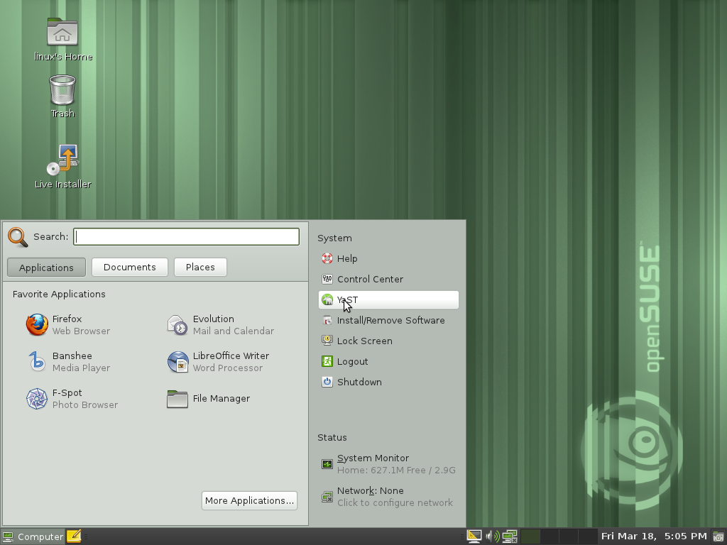 Para terminar con este apartado solo nos resta comentar el arte gráfico del que hace gala openSUSE 11.4, algo que va a gustos pero que raya en la excelencia para quien escribe, sobre todo después de una versión 11.3 bastante triste en estos términos y, de nuevo, manteniendo el halo de una versión 11.2 llena de elegancia y sobriedad. Aunque no hace falta decirlo, el verde domina la paleta.