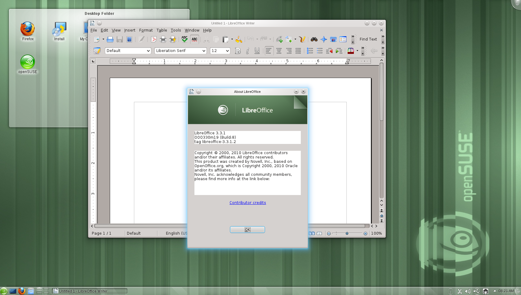 Suite ofimática LibreOffice, siendo openSUSE la primera distrubución mayoritaria en ofrecer el conocido fork de OpenOffice.org en su versión 3.3.1 (la última por el momento, también perfectamente integrada con KDE y con alternativas disponibles como KOffice o el combo Gnumeric – Abiword).