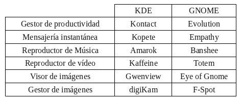 A partir de aquí la distribución se apoya en las herramientas propias de cada escritorio, destacando los juegos de GNOME y KDE entre otra utilidades. A continuación podemos ver una pequeña tabla comparativa con las aplicaciones más comunes: