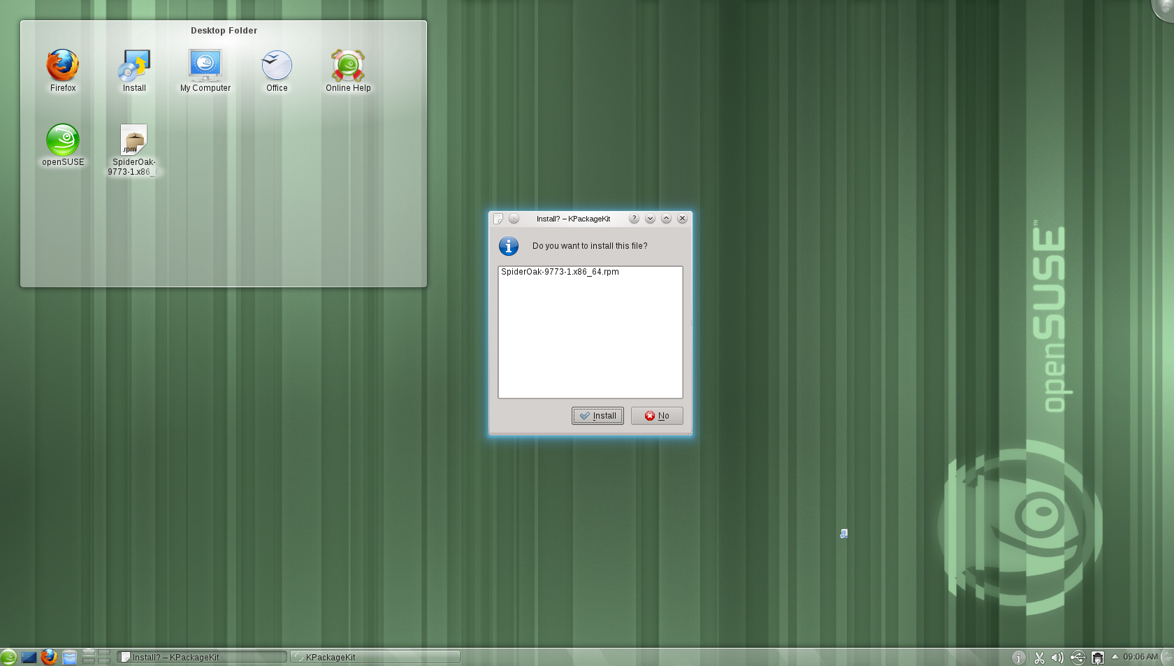 KPackageKit se inicia con el sistema, pero a veces no responde, o se solapa con YaST y zypper en los peores casos, apareciendo cuando vas a actualizar por tu cuenta y bloqueando el trámite. Y es que dos médicos son demasiados para un solo corazón, y puestos a elegir que se quede YaST. Un parche no muy acertado, la verdad (se supone que para la siguiente versión solventarán este «experimento»).