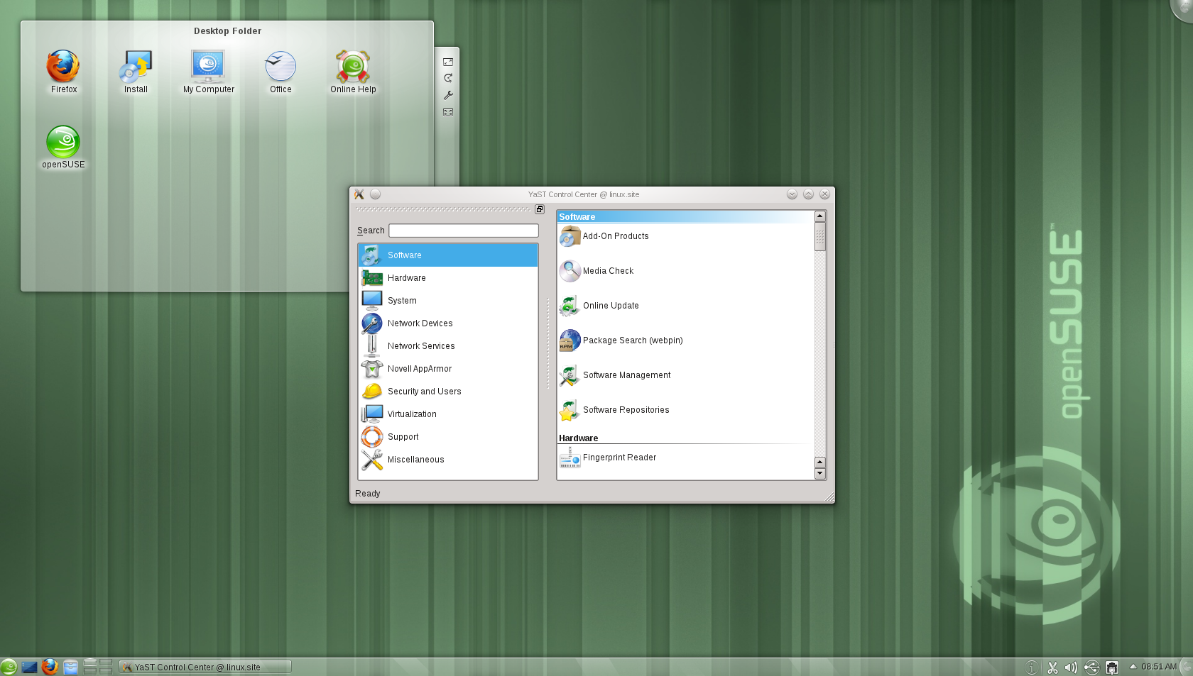 YaST como instalador, gestor de software visual y administración del sistema. YaST sigue siendo el más completo centro de control existente en Linux -con el permiso de Mandriva y sus «drakes»- y su combinación junto a «Preferencias del sistema» de KDE resulta en un control muy completo y accesible de casi cada detalle del sistema, avanzado o superficial.