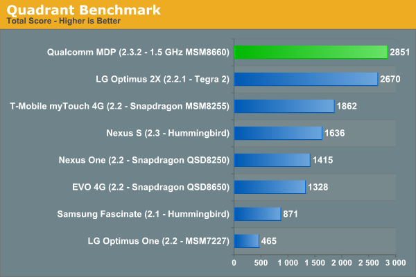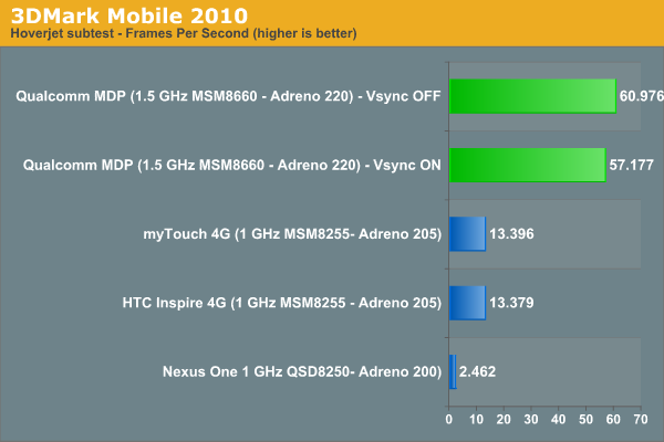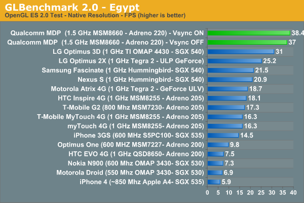 En la pasada feria CES la compañía mostró el que sería su futura plataforma de desarrollo móvil, Qualcomm Snapdragon Mobile Development Platform (MDP) con un SoC MSM8660 dentro. No permitieron realizar pruebas de rendimiento, pero está claro que el nuevo SoC promete un rendimiento impresionante, pasando de largo incluso al Apple A5 y NVIDIA Tegra 2.