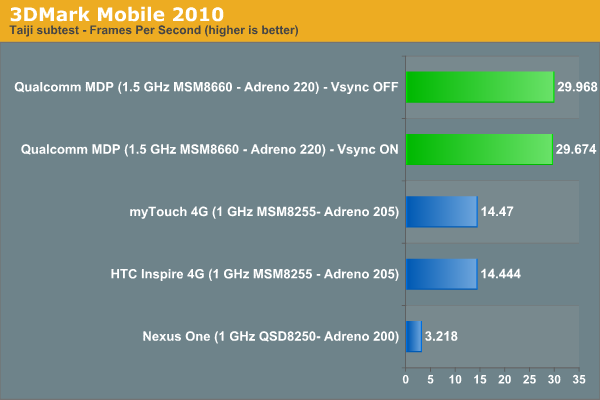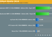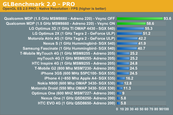 El nuevo SoC gráfico Adreno 220 promete un rendimiento de entre 2 y 5 veces el de Adreno 205, integrado en terminales como HTC Desire HD. Sin duda, la nueva apuesta SnapDragon de Qualcomm traerá consigo una mejora notable en los terminales que veremos para finales de este año. Veamos las pruebas de rendimiento. Las pruebas han sido pasadas con VSYNC encendido (límite 60 fps) y apagado.