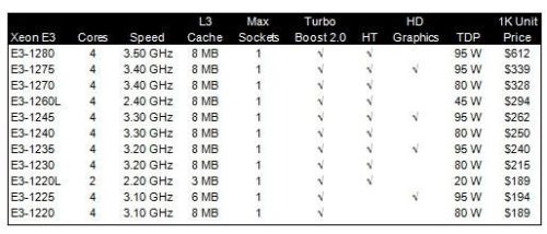 Once son los modelos Xeon E3-1200 anunciados con dos y cuatro núcleos (el doble de hilos de procesamiento nativo), 3, 6 u 8 Mbytes de caché de tercer nivel, un consumo TDP de 80 a 95 vatios y frecuencias de trabajo desde 3,1 a 3,5 GHz. Entre ellos se incluyen dos modelos especiales de especial eficiencia energética de 2 y 4 núcleos y un consumo respectivo de 20 y 40 vatios.