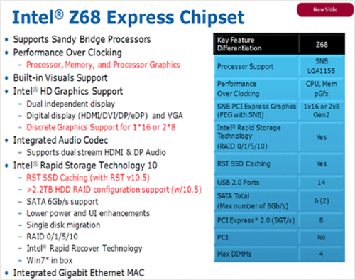 El chipset Z68 soportará todos los microprocesadores Sandy Bridge actuales y futuros. Entre sus principales características destacan el soporte para overclocking en CPU, memoria y procesador gráfico integrado, multi-GPU dedicada (dos x 8 Gen 2 o 1 x 16 SLI o Crossfire X)) con soporte Virtu GPU de LucidLogix que permite trabajar de manera simultánea con las gráficas (similar al Optimus de NVIDIA).