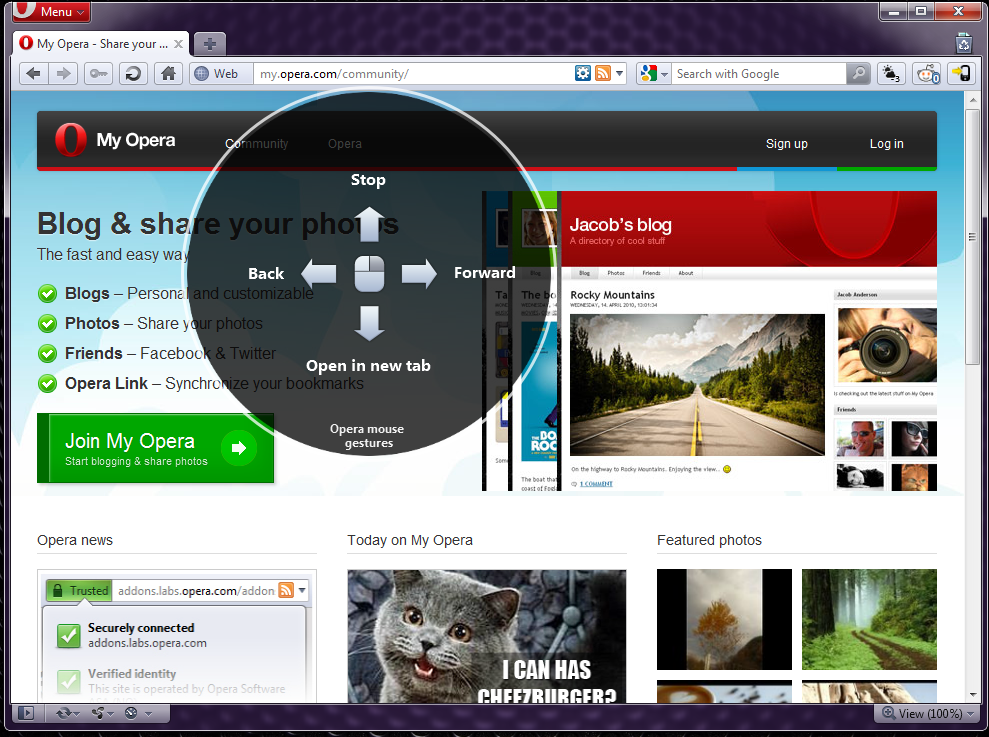 Con Opera 11 se introdujo la compatibilidad con extensiones y Opera 11.10 ha mejorado ligeramente el sistema de instalación y uso de las mismas aportando mayor estabilidad al software. Además de ello tenemos también el uso de gestos visuales del ratón que permiten recargar una página, o bien navegar adelante y a atrás desde el ratón de manera muy sencilla.