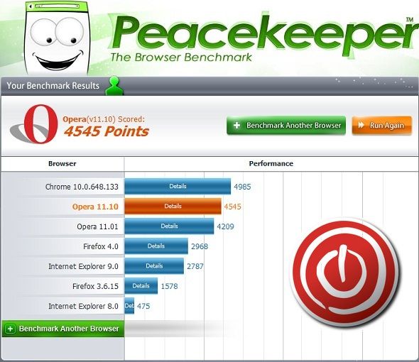 Tal y como podemos ver, los resultados en la suite de tests PeaceKeeper colocan a Opera 11.10 por delante de su versión anterior, y muy cerca de Google Chrome 10. Firefox 4 o Internet Explorer 9 están bastante por debajo en este test.
