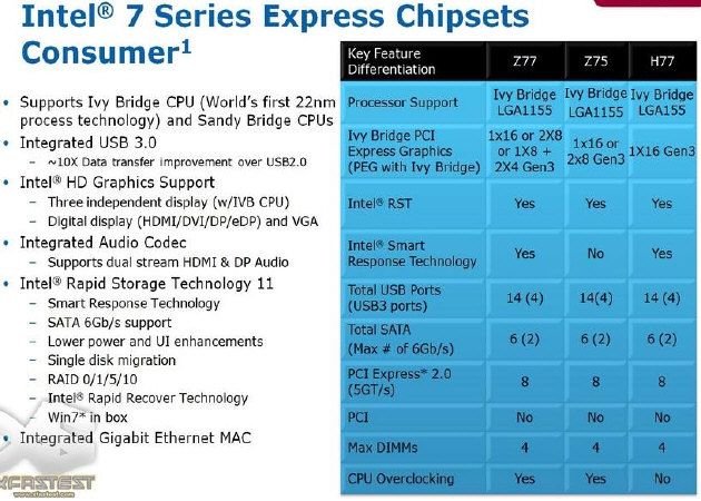 Los chipset serie 7 de Intel tendrán seis modelos distintos, tres dedicados al mercado de consumo (Z77, Z75 y H77) y otros tres al corporativo (Q77, Q75 y B77). Todos para placas con socket LGA-1155, por lo que permitirá utilizar los nuevos procesadores Ivy Bridge en las placas actuales con chipset serie 6, mediante una actualización de la BIOS.