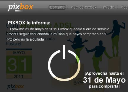 A partir del 31 de mayo del 2011, cerraremos el servicio de descarga de música Pixbox. Esto significa que si quieres disfrutar de algún contenido de música que tienes en tu biblioteca a partir del 31 de mayo, deberás comprarlo en la tienda antes de esta fecha
