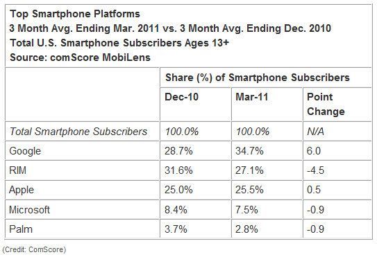 Con estas cifras, Android gana terreno y si ya dominaba claramente el sector de smartphones en Estados Unidos, el último informe de ComScore relativo al mes de marzo le asigna casi un 35 por cuota de mercado, a la cabeza de sistemas operativos móviles y ampliando ventaja. Por ello, no sorprende la apuesta tan fuerte de Google en el sector con un primer día del I/O 2011 de protagonismo absoluto para Android.
