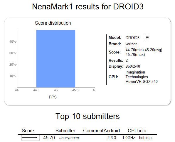 Los resultados de rendimiento sobre el benchmarking NenaMark1 son buenos aunque no se conoce la versión del firmware utilizado y la fase de desarrollo. El sistema operativo era una versión actualizada de Gingerbread Android 2.3.3. No se conoce la disponibilidad del DROID 3, uno de los smartphones más potentes que hemos visto con teclado físico.