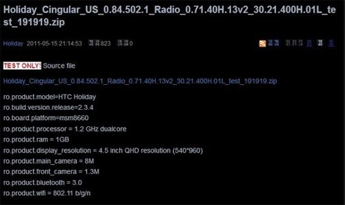 Dispondría de una pantalla aun más grande que modelos como el HD2 o Desire con un tamaño de 4,5 pulgadas con resolución nativa qHD 540×960 píxeles. Estaría motorizado por un chip Snapdragon de Qualcomm con procesador de doble núcleo a 1,2 GHz junto a 1 Gbyte de memoria RAM.