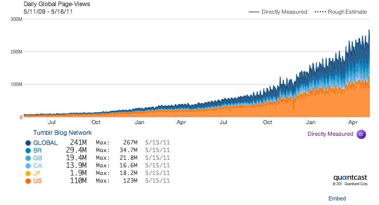 Ayer, la red de Tumblr registró más de 250 millones de páginas vistas por día, lo que es realmente mucho tráfico con 9 millones de visitantes únicos. A modo de comparación, Tumblr obtuvo dicho tráfico en todo el mes de julio de 2009, con 50 millones de dusuarios. Ahora está acercándose a 80 millones de visitantes únicos por mes con 6.800 millones de páginas vistas.