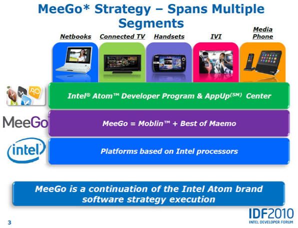 MeeGo 1.2 es compatible con procesadores Atom y también con ARM v7 e Intel pretende extenderlo a netbooks, televisiones inteligentes, reproductores multimedia, sistemas de info-entretenimiento para automóviles y por supuesto tabletas y smartphones.