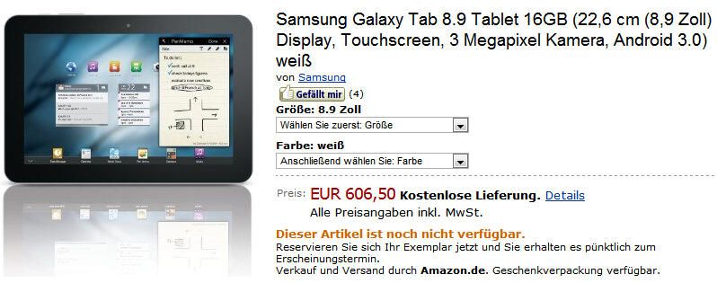 Amazon Alemania ha abierto el plazo de reservas para el nuevo tablet de Samsung con pantalla de tamaño intermedio entre las Galaxy Tab de 7 y 10 pulgadas. No es barato, 606 euros aunque se trata de la versión Wi-Fi + 3G.