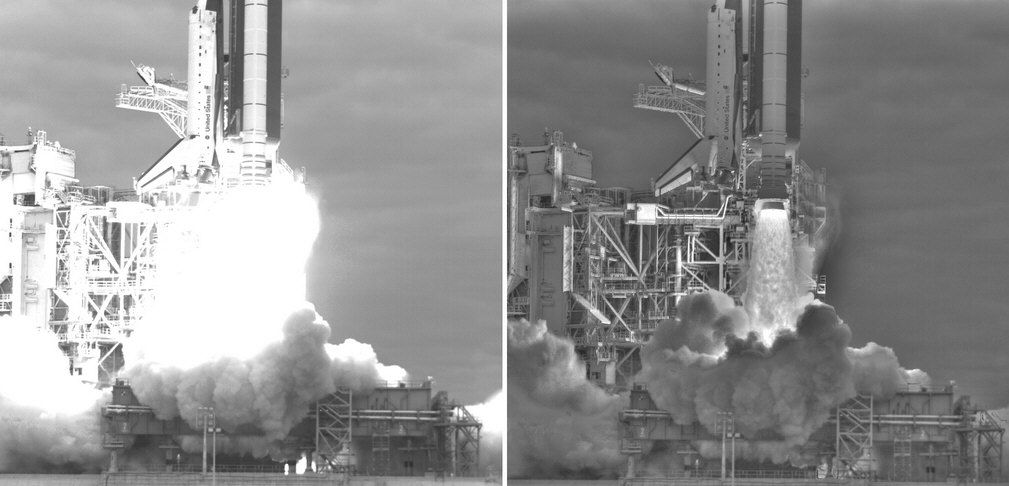 Las imágenes fueron procesadas para adaptar a los niveles de luz ordinaria el brillo del chorro de gases expulsado por los cohetes. El resultado es simplemente espectacular, colofón para el retiro de este orbitador que prepara el fin del programa de transbordadores espaciales de la NASA cancelándose en unos meses tras treinta años de servicio con las misión final para el Atlantis.