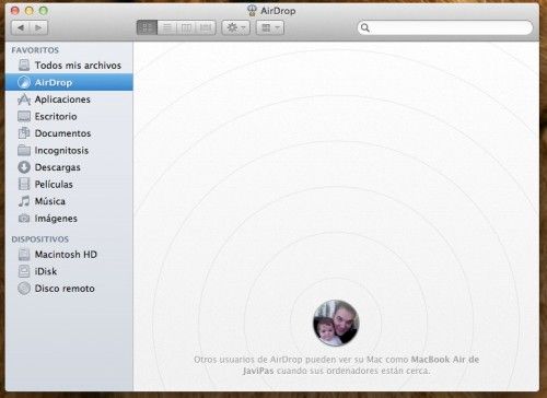 Este servicio está accesible desde el Finder, que en su margen izquierdo mantiene una lista de carpetas predefinidas (Imágenes, Documentos, Música, etc), a la que se añade AirDrop para permitirnos compartir archivos más fácilmente que nunca con otros equipos Mac OS X. La característica lamentablemente no funciona con otros sistemas operativos, y utiliza una conexión WiFi P2P, que precisamente se destaca por no necesitar un punto de acceso o una infraestructura WiFi disponible.