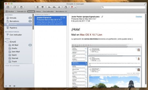 Otra de las novedades incluida en Mail es la vista de Conversaciones, que copia el funcionamiento de las conversaciones de Gmail para agrupar los mensajes con un mismo tema de forma sencilla. El aspecto de las conversaciones es interesante, aunque la disposición visual podría haberse mejorado por ejemplo con botones que expandan o contraigan todos los mensajes menos el último, por ejemplo, como hace Gmail. Lo que sí añade Mail en las conversaciones es un contador del número de mensaje, además de mostrarlos por orden cronológico inverso, con el mensaje más moderno más arriba, al contrario que Gmail.