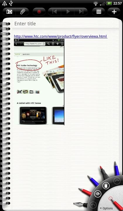 El cuaderno de notas es otra de las aplicaciones sobre las que más intensamente ha trabajado HTC para ofrecer una experiencia diferencial con respecto a otras tablets. Ya sea a través de la aplicación o del widget, podemos capturar todo tipo de elementos como texto, fotografías o vídeos, e incluso escritura manual gracias al stylus con el que se acompaña la libreta.