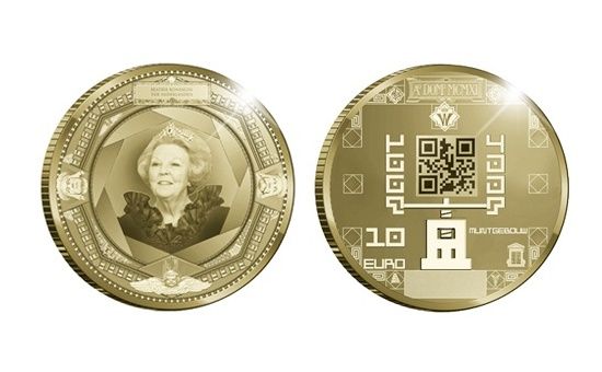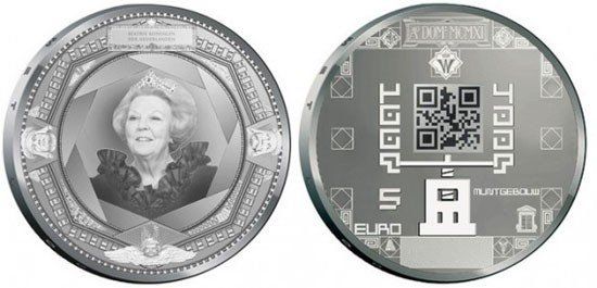 El último ejemplo de la aplicación de los QR Codes lo tenemos en las monedas conmemorativas de Royal Dutch Mint con valor de 5€ -plata- y 10 € -oro- en honor a su 100 aniversario. La parte frontal muestra el tradicional busto de las monedas y en la parte trasera de las mismas hay un QR Code que dirige a la web de Royal Dutch Mint.
