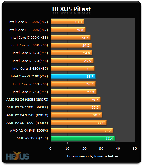 Además, la frecuencia de de serie de la CPU de esta APU (2,9 GHz) es inferior a la de los Sandy Bridge, mucho más modernos y avanzados tecnológicamente. Únicamente en test como CineBench 10 y POV-Ray capaces de aprovechar los cuatro núcleos de la CPU el A8 se impone al Core i3-2100. También en aplicaciones que usen OpenCL 1.1, C++ AMP o DirectCompute aprovechando el procesamiento en paralelo del chip gráfico.