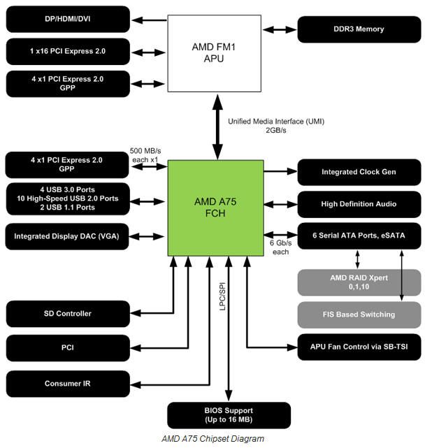 Junto al nuevo socket, AMD ofrece nuevo chipset denominado A75 y alguna variante más posteriormente. Conjunto de chips que junto a la controladora del procesador permite a los fabricantes de placas ofrecer cuatro slots de memoria DDR3 para un máximo de 16 Gbytes, puertos SATA-III (6 Gbps), SATA-III (3 Gbps), Firewire, Gigabit Ethernet LAN, USB 3.0, USB 2.0, eSATA, audio multicanal, salidas de video analógica VGA y digitales DVI y HDMI.