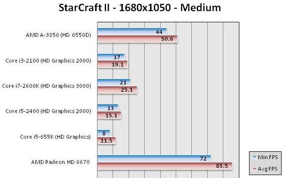 Por contra, los microprocesadores Intel Core i5 superan la capacidad general de proceso de la APU Llano analizada (A8-3850 con cuatro núcleos). Incluso un ‘modesto’ Core i3-2100 de doble núcleo bate (aunque muy ligeramente) el rendimiento en procesamiento del A8. La explicación es sencilla ya que la CPU de los Llano está basada en un K10 con varios años a su espaldas (noviembre de 2007) comportándose como un Phenom X4 de gama baja.