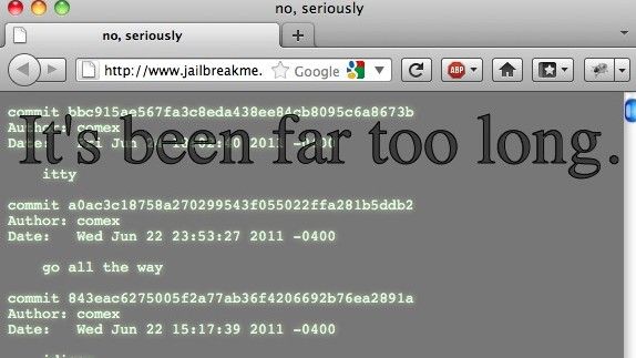 Tal y como se puede ver en la captura de la web, Comex hace un repaso de todos los tweets desde que se puso a trabajar en jailbreakme.com. Hablamos de nada menos que desde agosto del año pasado y parece que finalmente todo llega a su fin con el producto Jailbreakme 3.0.