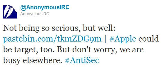 Entrada «aprovechando los fallos de seguridad de los sistemas de Apple», mencionan aunque el grupo relaja la indicencia: “Pero no se preocupen, estamos ocupados en otras cosas“, indicaron. El suceso podría estar relacionado con la operación ‘AntiSec’ anunciada por Anonymous «contra cualquier empresa o gobierno que actúe en contra de los intereses de la humanidad».