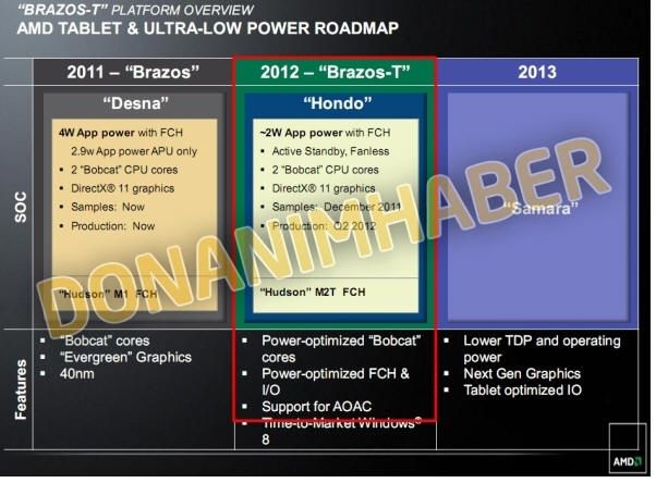El chipset utilizado sería el Hudson M2T con un TDP de 1 vatio y amplia conectividad SATA y USB. Según las diapositivas, AMD enviaría muestras del chip Hondo a sus socios en el mes de diciembre comenzando la producción en el segundo trimestre de 2012 para un lanzamiento a tiempo del lanzamiento del Windows 8 para tablets.