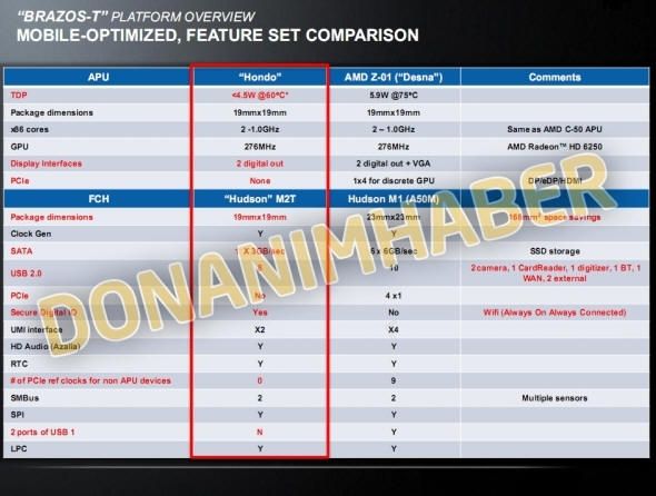 Se trataría de los nuevos chips ‘Hondo’ fabricados en procesos de 40 nanómetros, con dos núcleos x86 Bobcat a 1 GHz y un chip gráfico Radeon HD 6250 con frecuencia de 276 MHz, soporte DirectX 11 y capaz de reproducir vídeo Full HD. Soportaría PCI-Express y un canal de memoria DDR3. El TDP del chip está fijado en 4,5 vatios.