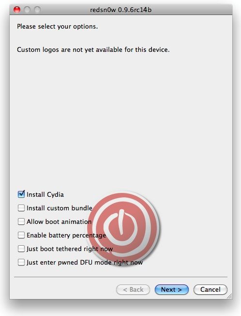 – Paso 4. Pulsa Next y llegarás a una pantalla de opciones adicionales, en la que además de instalar Cydia, opción obligatoria para realizar jailbreak untethered, podemos elegir ciertas opciones extra como son permitir logos personalizados en el arranque o bien mostrar el porcentaje de batería que queda. Pulsamos Next.