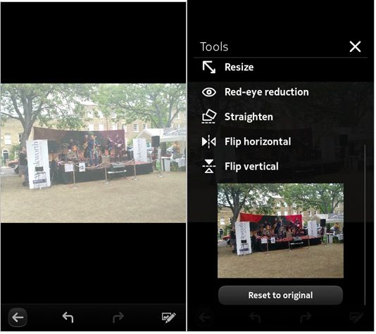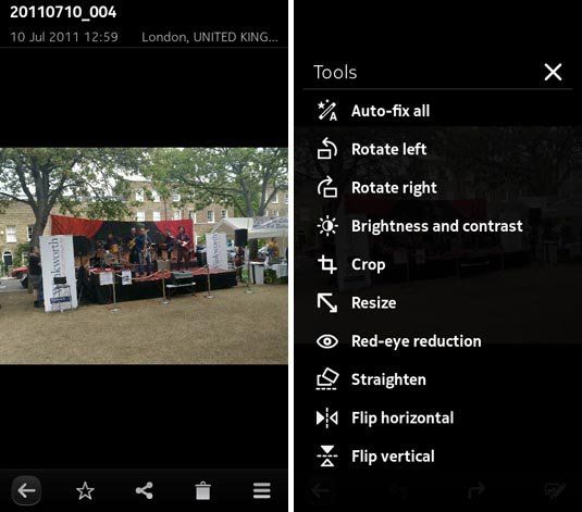 Entre las manipulaciones posibles está el tradicional ajuste de brillo y contraste, reducción de ojos rojos, enderezar, voltear horizontal y verticalmente, cambiar el tamaño, recortar, girar y un ajuste automático.