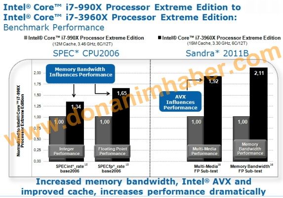 Los procesadores fueron enfrentados en pruebas como Cinebench 11.5, POV-Ray 3.7, 3DMark 11 physics, Pro-Show Gold 4.5, SPECint_rate base2006, SPECfp_rate base2006 y el SiSoft SANDRA 2011B mostrando el nuevo modelo un rendimiento espectacular. Además de las nuevas instrucciones y potencia propia el Core i7-3960X aprovechará el nuevo sistema de cuádruple canal de memoria implementando para la plataforma.