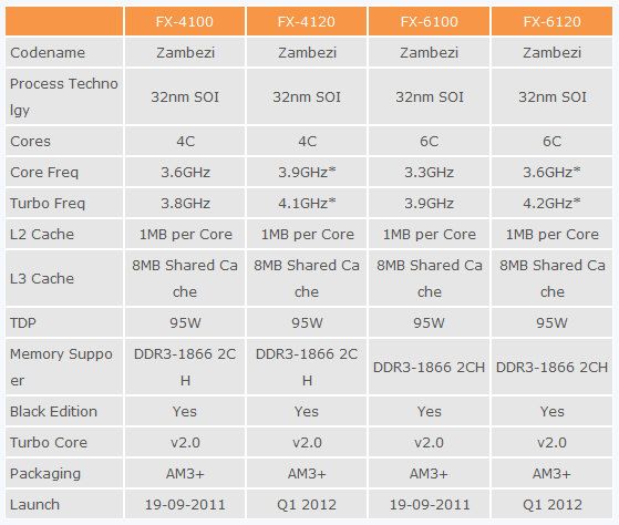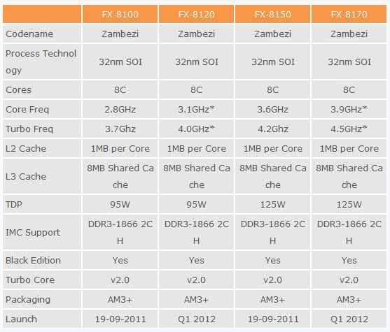 Como puedes ver en los cuadros adjuntos, todos tendrán soporte (controladora integrada en el micro) para doble canal de memoria DDR3-1866, 1 Mbyte de caché L2 por núcleo, 8 Mbytes de caché de tercer nivel, un TDP de 95 o 125 vatios y la versión 2.0 del Turbo Core de AMD para aumentar la frecuencia de trabajo por defecto.