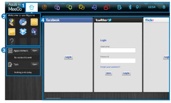 Además de aplicaciones de reproducción multimedia, el MeeGo de este EeePC incluye la aplicación British Council English Language Learning para aprendizaje de inglés, acceso directo a redes sociales en una interfaz renovada, simple pero intuitiva y acceso al Chrome Webstore desde el navegador de Google instalado para ejecución de aplicaciones web.
