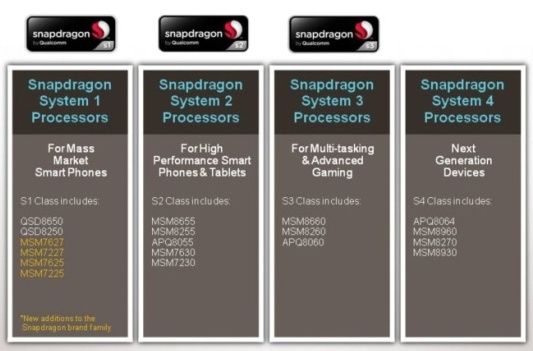 La nueva denominación de Qualcomm establece cuatro divisiones en sus diseños Snapdragon para smartphones y tablets: S1, S2, S3 y S4. Básicamente lo que debemos conocer es que a mayor número más prestaciones.