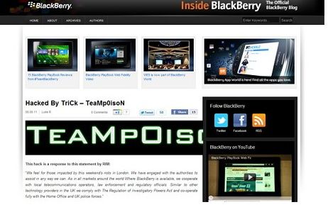 El grupo ‘Teampoison’ ha atacado Inside BlackBerry, el blog oficial del fabricante canadiense, logrando introducir un texto en el que amenaza a Research In Motion si coopera con la policía británica entregando datos de usuarios de sus terminales.
