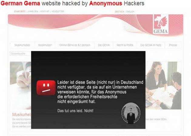 El grupo ciberactivista internacional mantiene bloqueado el portal web de la GEMA, la sociedad de compositores musicales alemanes, con ataques que comenzaron el fin de semana redireccionando a los usuarios hacia páginas de contenido irónico en el se informaba que no era posible acceder a la misma ‘porque la entidad se negaba a pagar a los hacker’.