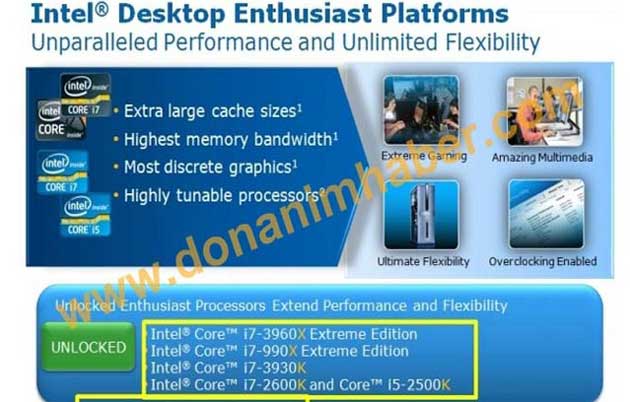 Plataforma con nuevos socket LGA-2011 y chipset X79 con tres modelos disponibles en el lanzamiento Core i7-3960X EE, Core i7-3930K y Core i7-3820. El tope de gama sería el primero con 6 núcleos y 12 hilos de procesamiento nativo con hyperthreading y una frecuencia de serie desde 3,3 a 3,9 GHz.