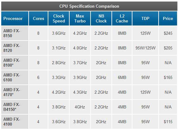 En cuanto a modelos, siete son los anunciados por AMD para la gama FX aunque únicamente son cuatro los disponibles para el lanzamiento, dos de ocho núcleos, uno de seis núcleos y otro con cuatro núcleos de procesamiento nativo. El tope de gama de la plataforma es el FX-8150 aunque no será raro que AMD comercialice en un futuro algún modelo aún más potente. Sus características principales completas son: