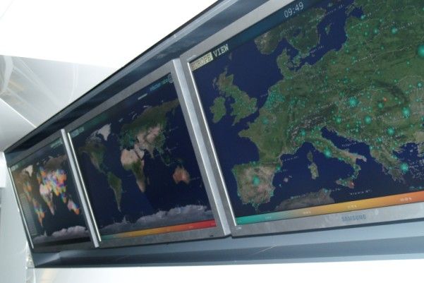 El laboratorio de Malware de ESET es muy similar a otros de los que hemos tenido la oportunidad de visitar. Estructurado como una gran zona de control, cuatro grandes monitores reflejan casi en tiempo real los datos que recogen los servidores de ESET: datos relativos a la base instalada, centros o ciudades que presentan amenazas anómalas, porcentajes de malware detectado, etc.