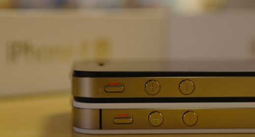 El iPhone 4S es el teléfono de abajo y como se puede ver el botón de silencio ha sido desplazado a su derecha unos milímetros.