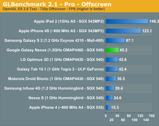 A primera vista los resultados apuntan a lo que cabría esperar. El nuevo Galaxy Nexus disfruta de una CPU de doble núcleo más potente, sin embargo, el chip gráfico es de generación anterior al de iPhone 4S, el mismo que el de Nexus S.