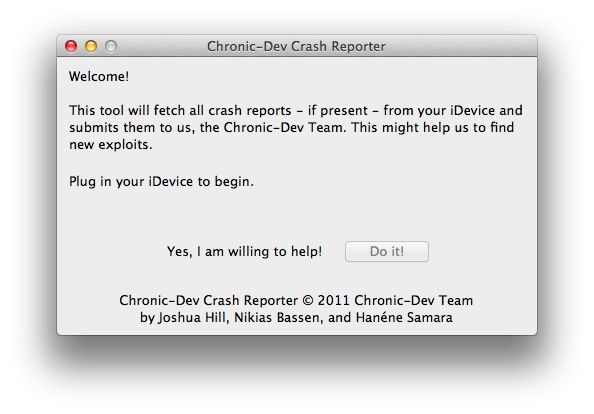 La aplicación en cuestión se conoce como C-Dev Reporter (descargar) y básicamente manda todos los informes de fallos recopilados en tu dispositivo a un servidor de Chronic Dev Team en lugar de a Apple a través de iTunes. Esos informes son estudiados por los miembros del equipo y el conocimiento adquirido probablemente lleve de cara al futuro para encontrar exploits que permitan realizar jailbreak untethered a iOS 5.