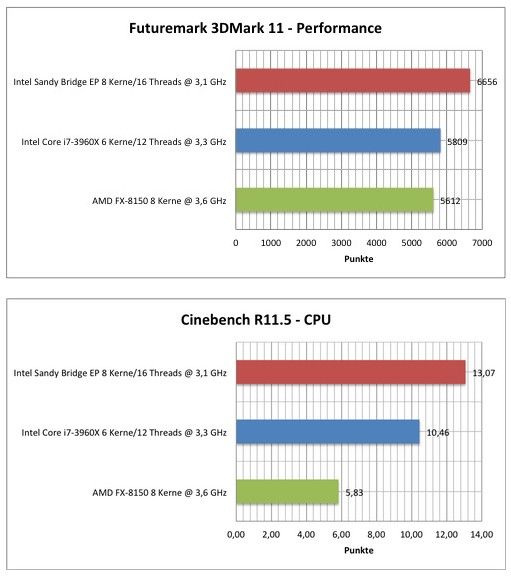 La frecuencia de funcionamiento en las pruebas era de 3,1 GHz, algo inferior a lo ofrecido por el Core i7 3960x, recordemos el más potente de la gama de consumo. Por lo mostrado en las imágenes en el benchmark Cinebench R11.5 vemos un aumento de rendimiento del 30 por ciento sobre el Core i7 mientras que en el Futuremark 3D Mark 11 se reduce a un aumento del 15 por ciento.