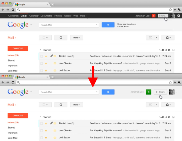 Uno de los primeros cambios que pudieron percibir los usuarios fue el de la típica barra blanca de navegación entre servicios -esa que ahora anuncia el +Tú-, que se volvió negra y adquirió nuevas funciones. Pero ese era tan solo el tímido principio. Desde entonces ha llovido mucho, y a punto está de llegar uno de los cambios más significativos en lo que se refiere a la integración, estética pero también práctica, de los diferentes servicios del gigante de Internet.