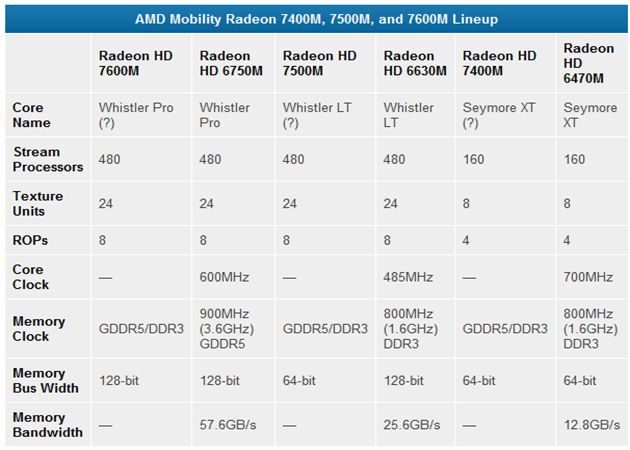 Como tope de gama a la espera de las 7900M (que no se sabe si abrirán la nueva generación de 28 nm) nos encontramos con las 7600M con el mismo número de procesadores y unidades de texturas que la anterior mejorando el ancho de banda de memoria gracias a una interfaz de 128 bits y mayor cantidad dedicada y el uso del núcleo Whistler Pro que motoriza la actual Radeon HD 6750M.